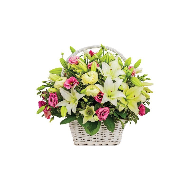 Radiating warmth and charm, Blush & Beam features a lively combination of soft pink roses and sunny yellow lilies, beautifully arranged in a handcrafted cane basket. This fresh floral blend is perfect for joyful occasions like birthdays, congratulations, housewarmings, or to simply share positivity and love.