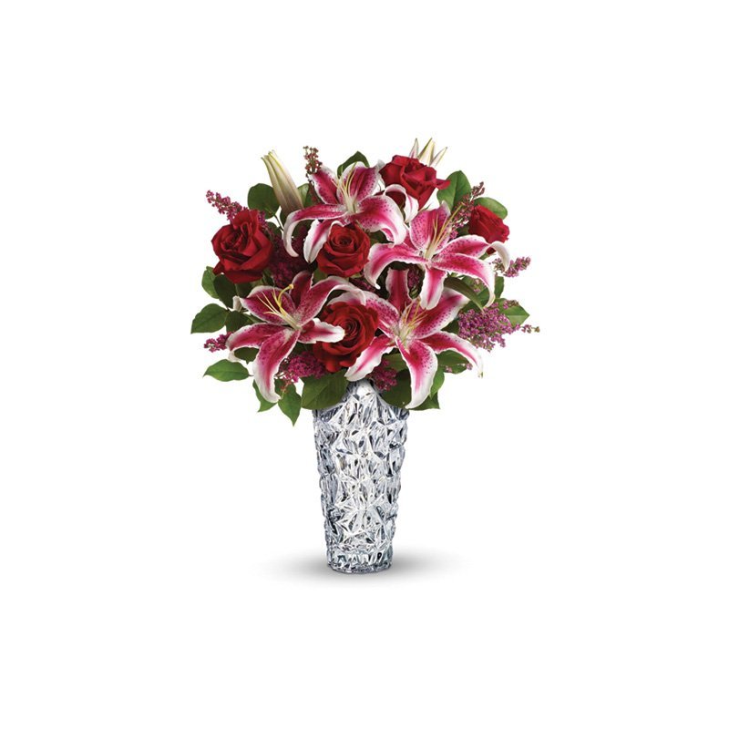 The soft-petaled lilies and rich roses blend harmoniously, making it a beautiful addition to home décor or heartfelt gifting.