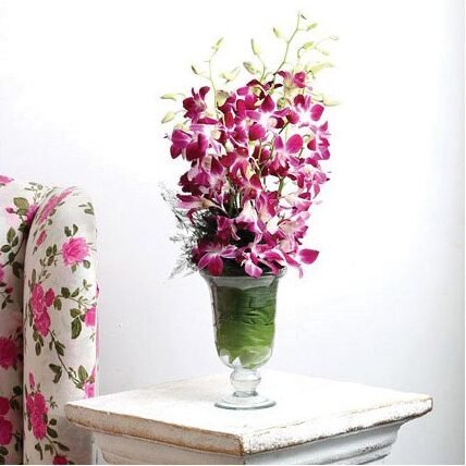 Gift your loved ones a wonderful and amazing arrangement of purple orchids. It symbolizes elegance, thoughtfulness and care for the person to whom you are sending this floral arrangement. This bunch comprises of 10 purple orchids in a samadhan glass vase efficiently garnered to perfection. Spread the fragrance of respect and care for your loved one and make the person feel special.