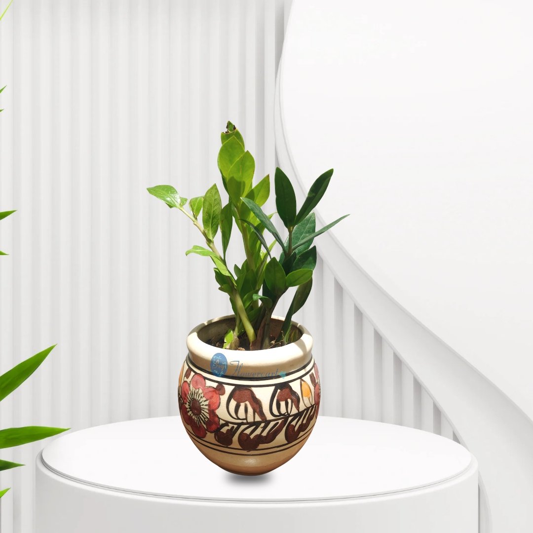 The Zamia (ZZ) plant is loved for its glossy green foliage and low-maintenance nature, making it an excellent indoor plant for homes and offices. Often associated with prosperity and positive energy, it makes a meaningful gift for housewarmings and new beginnings. Each Zamia plant is paired with a beautiful ceramic planter that may vary in design, as every piece is exclusively curated, adding a unique decorative touch. Available for indoor plant delivery in Ahmedabad and Vadodara.